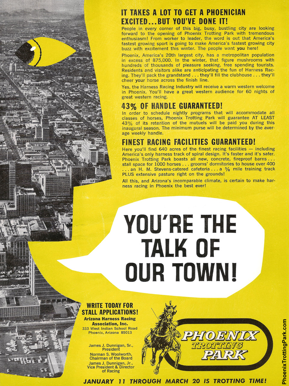 A Phoenix billboard advertising the Trotting Park. Year is not known, but is estimated to be early 1965. Source: Outdoor Advertising Association of America (OAAA), Duke University Digital Collection.