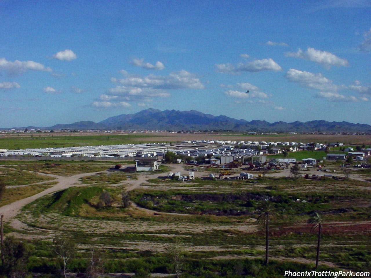 The Trotting Park with Cotton Lane RV Resort in the background, and the Sierra Estrella mountains on the horizon. Photo by: Tim Roberts Photography (2009). Used with permission.